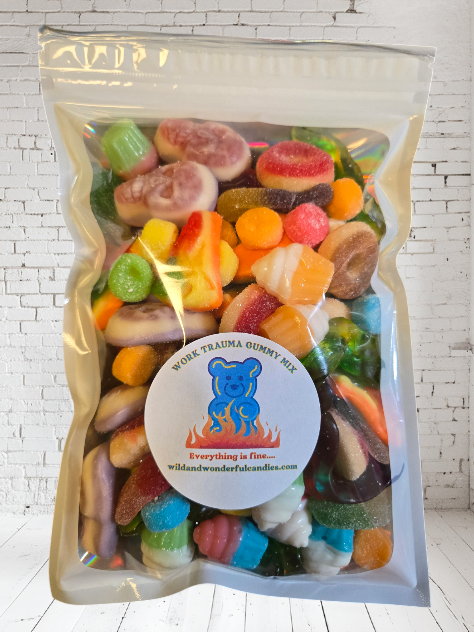Check out our latest creation: the Work Trauma Gummy Mix! This delightful blend might just be our best yet, born from a collective brainstorming session of what work gives us instead of a raise. It's packed with everything that embodies the work experience, including Pizza, Donuts, Popsicles, Cupcakes, Jelly-filled Skulls (a nod to how we sometimes feel), Twin Snakes (because every workplace has its share of troublemakers), and Sour Popper Balls (we all know what these are representing). Grab yours now and add a little sweetness to your workday!